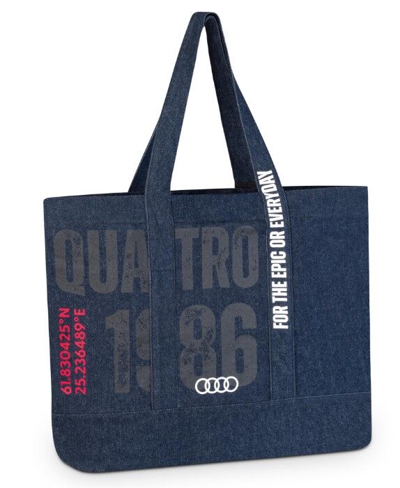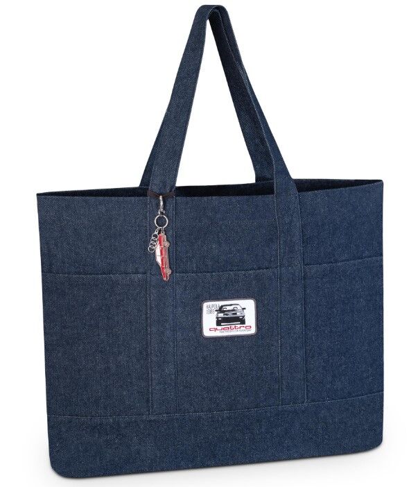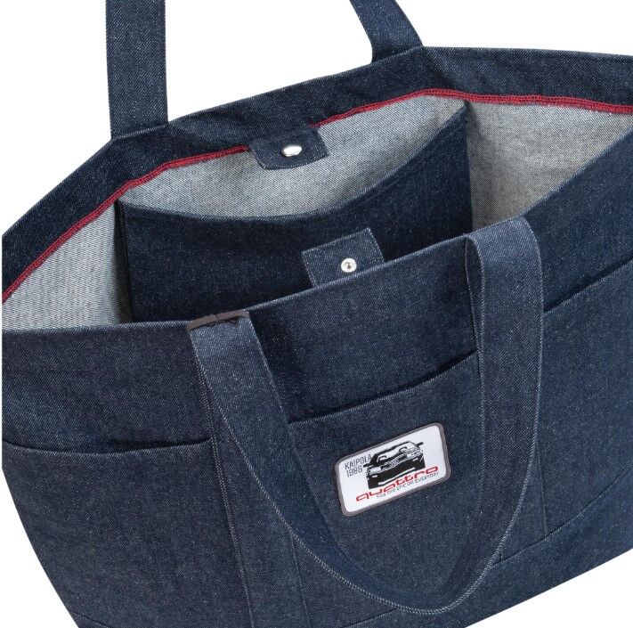Tilava kangaskassi denim-materiaalista, jossa erillinen sisätasku, ja ulkopuolella piilotaskut. Kassissa kaksi kantohihnaa ja kassissa on neppari kiinnitys